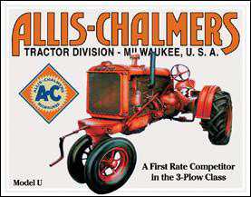 TD1133 Allis Chalmers farm tractor Model U nostalgic tin sign. Collector metal signs. A collection of yesterday's signs. Great for decorating homes, offices, restaurants, etc. TD1133 Lithographed steel metal. Mounted on a black 20" x 16" card.