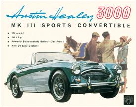 TD-1216 Austin Healey 3000 MK III sports convertible nostalgic tin sign. Collector metal signs. A collection of yesterday's signs. Great for decorating homes, offices, restaurants, etc. Lithographed steel metal. TD1216 measures 16"W x 12.5"H, and mounted on a black 20" x 16" card.