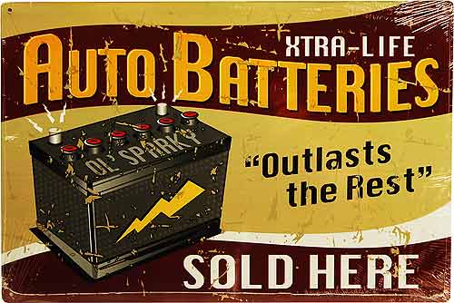 M-764 Auto Batteries Sold Here nostalgic tin sign. Collector metal signs. A collection of yesterday's signs. Great for decorating homes, offices, restaurants, etc. Lithographed steel metal. M764. This tin sign is shrink wrapped on to a 19" x 12.5" piece of cardboard for protection during transport.