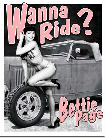 PD-1791 Bettie Page - Wanna Ride nostalgic tin sign. Collector metal signs. A collection of yesterday's signs. Great for decorating homes, offices, restaurants, etc. Lithographed steel metal. Size: 12.5"W x 16"H. PD1791 mounted on a black 16" x 20" card.