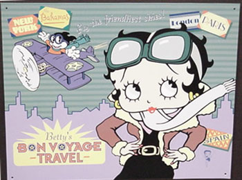 PG-539 Betty Boop Bon Voyage tin sign. Collector metal signs. A collection of yesterday's signs. Great for decorating homes, offices, restaurants, etc. Lithographed steel metal. Mounted on a black 20" x 16" card.