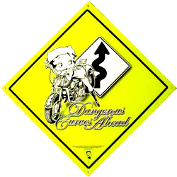 P672 Betty Boop Curves nostalgic tin sign. Collector metal signs. A collection of yesterday's signs. Great for decorating homes, offices, restaurants, etc. Lithographed steel metal. Mounted on a black 20" x 16" card. P672