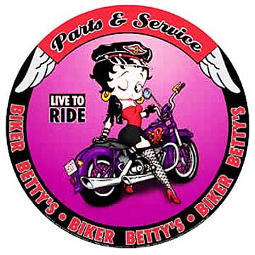 BP-07 Betty Boop: Parts & Service Motorcycle nostalgic round tin sign. Collector metal signs. A collection of yesterday's signs. Great for decorating homes, offices, restaurants, etc. Lithographed steel metal. BP07 measures 12" diameter. This tin sign is shrink wrapped on to a 12.5" x 19" piece of cardboard for protection during transport.