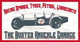 TD-1164 Busted Knuckle Auto nostalgic tin sign. Collector metal signs. A collection of yesterday's signs. Great for decorating homes, offices, restaurants, etc. Lithographed steel metal. Mounted on a black 20" x 16" card.