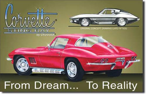 TD-694 Chevy Corvette Stingray nostalgic tin sign. Chevrolet Sting Ray Collector metal signs. A collection of yesterday's signs. Great for decorating homes, offices, restaurants, etc. TD694 Lithographed steel metal. TD694 Size: 16"W x 10.5"H. Mounted on a black 20" x 16" card. GM is a trademark of the General Motors Corporation.