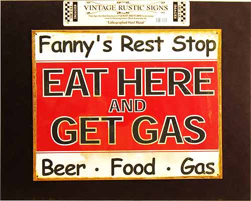 CG-529 Fanny's Rest Stop Eat Here And Get Gas nostalgic tin sign. Collector metal signs. A collection of yesterday's signs. Great for decorating homes, offices, restaurants, etc. Lithographed steel metal. Mounted on a black 20" x 16" card. CG529