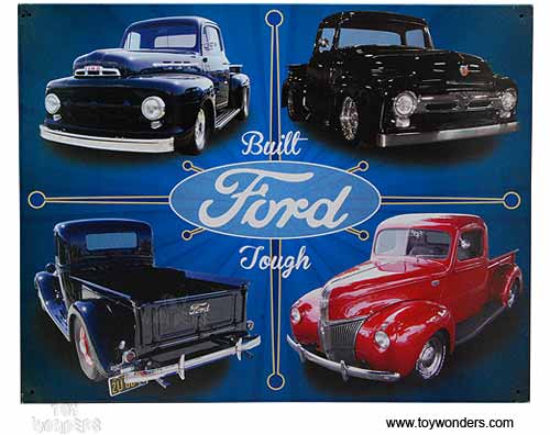 TG-786 Ford Built Tough F100 Pickup Truck nostalgic tin sign. Collector metal signs. A collection of yesterday's signs. Great for decorating homes, offices, restaurants, etc. Lithographed steel metal. TG786 Size: 15"W x 12"H. Mounted on a 20" x 16" black card.