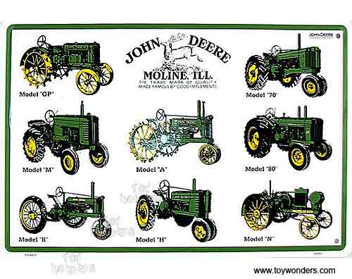 M-466 John Deere Collage nostalgic tin sign. Collector metal signs. A collection of yesterday's signs. Great for decorating homes, offices, restaurants, etc. Lithographed steel metal. M466 measures 18" x 12". This tin sign is shrink wrapped on to a 19" x 12.5" piece of cardboard for protection during transport.