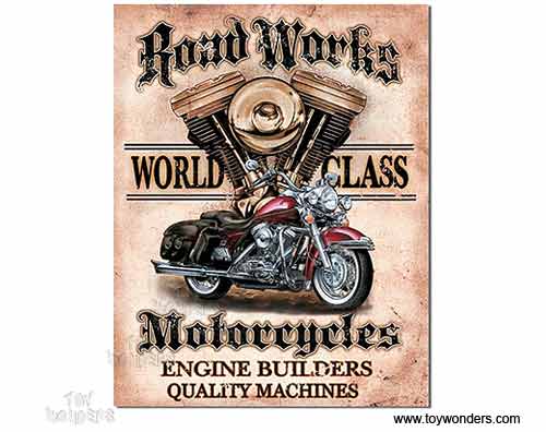 TD-1536 Legends - Road Works World Class Motorcycle (Engine Builders Quality Machines) tin sign. Collector metal signs. A collection of yesterday's signs. Great for decorating homes, offices, restaurants, etc. Lithographed steel metal. TD1536. Mounted on a black 20" x 16" card.