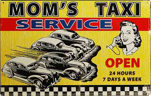 M-758 Mom's Taxi Service nostalgic tin sign. taxicab Collector metal signs. A collection of yesterday's signs. Great for decorating homes, offices, restaurants, etc. Lithographed steel metal. M758. This tin sign is shrink wrapped on to a 19" x 12.5" piece of cardboard for protection during transport.
