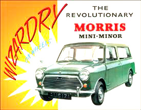 TD-1229 The revolutionary Morris Mini-Minor nostalgic tin sign. Mini Minor Collector metal signs. A collection of yesterday's signs. Great for decorating homes, offices, restaurants, etc. Lithographed steel metal. Mounted on a black 20" x 16" card. TD1229.