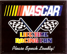 SG-722 Nascar Life Time Racing Fan tin sign. Collector metal signs. A collection of yesterday's signs. Great for decorating homes, offices, restaurants, etc. Lithographed steel metal. Mounted on a black 20" x 16" card. SG722.