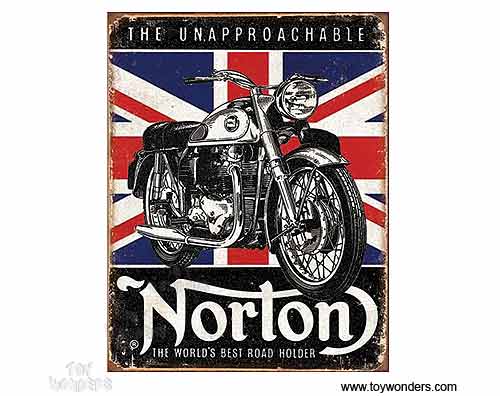 TD-1953 Norton Roadholder Motorcycle tin sign. Collector metal signs. A collection of yesterday's signs. Great for decorating homes, offices, restaurants, etc. Lithographed steel metal. TD1953. Mounted on a black 20" x 16" card.