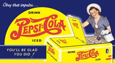 B-434 Tin Sign: Pepsicola - Obey That Impulse. Collector metal signs. A collection of yesterday's signs. Great for decorating homes, offices, restaurants, etc. Lithographed steel metal. Mounted on a black 20" x 16" card. B434
