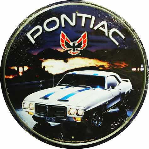 RD-96 Pontiac Firebird nostalgic round tin sign. Collector metal signs. A collection of yesterday's signs. Great for decorating homes, offices, restaurants, etc. Lithographed steel metal. RD96 measures 12" diameter. This tin sign is shrink wrapped on to a 12.5" x 19" piece of cardboard for protection during transport.