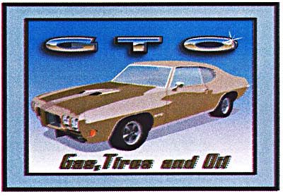 M582 Pontiac GTO Gas, Tires and on nostalgic tin sign. Collector metal signs. A collection of yesterday's signs. Great for decorating homes, offices, restaurants, etc. Lithographed steel metal. M582 measures 17" x 11". This tin sign is shrink wrapped on to a 19" x 12.5" piece of cardboard for protection during transport.