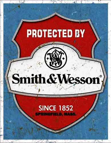 OD1682 Protected by Smith & Wesson nostalgic tin sign. Collector metal signs. A collection of yesterday's signs. Great for decorating homes, offices, restaurants, etc. Lithographed steel metal. Mounted on a black 20" x 16" card. OD1682