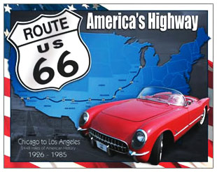 TD-1548 Tin Sign: Route 66 America's Highway 1926 - 1985. Rt 66 Collector metal signs. A collection of yesterday's signs. Great for decorating homes, offices, restaurants, etc. Lithographed steel metal. Mounted on a black 20" x 16" card. TD1548