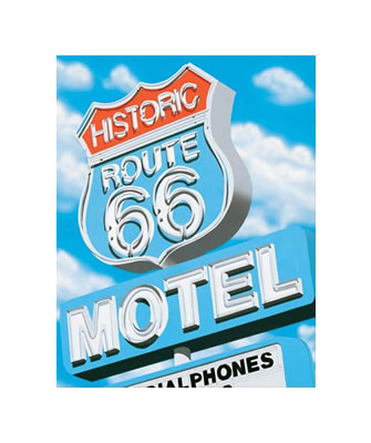 CD-1522 Route 66 Motel nostalgic tin sign. RT 66 collector metal signs. A collection of yesterday's signs. Great for decorating homes, offices, restaurants, etc. Lithographed steel metal. Mounted on a black 20" x 16" card. CD1522