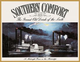 BD-964 Southern Comfort Steamboat tin sign. Collector metal signs. A collection of yesterday's signs. Great for decorating homes, offices, restaurants, etc. Lithographed steel metal. Mounted on a black 20" x 16" card. BD964