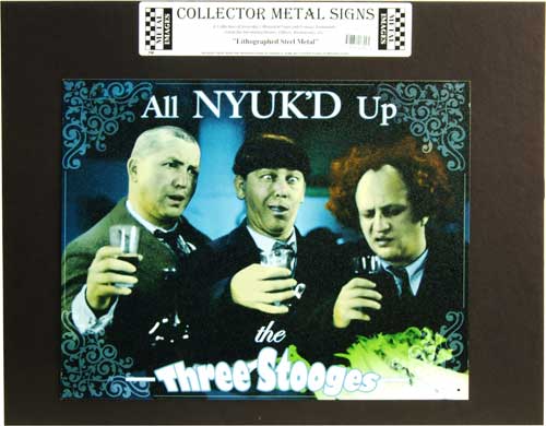 PG-765 The Three Stooges All NYUK'D Up tin sign. Collector metal signs. A collection of yesterday's signs. Great for decorating homes, offices, restaurants, etc. Lithographed steel metal. Metal Sign size is 15"W x 12"H. Mounted on a black 20" x 16" card. PG765.