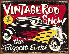 TD1324 Vintage Hot Rod Show tin sign. Collector metal signs. A collection of yesterday's signs. Great for decorating homes, offices, restaurants, etc. Lithographed steel metal. Mounted on a black 20" x 16" card. TD1324