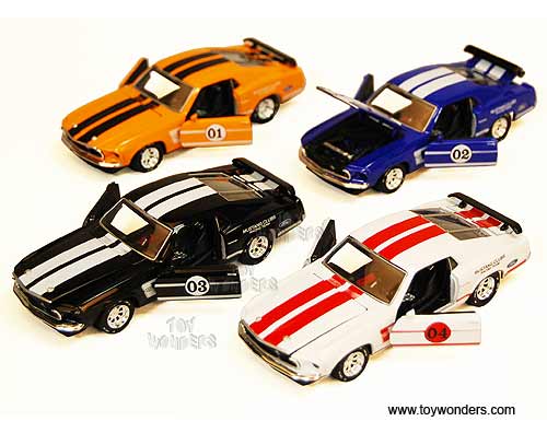 18042D Tin's Toys - 1969 Ford Mustang Boss 302. 1:38 scale diecast model car. This 1969 Ford Mustang Boss 429 is a 5" long diecast with pullback motor action. This 69 Ford Mustang Club racing team features openable doors, hood & trunk. Tins' Metal. 48 pcs per inner box and 12 pcs per display box. 18042 in assorted color.