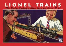 TD-749 Lionel Trains tin sign. Collector metal signs. A collection of yesterday's signs. Great for decorating homes, offices, restaurants, etc. Lithographed steel metal. Mounted on a black 20" x 16" card.