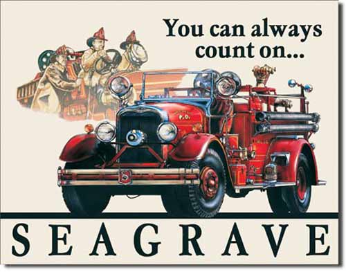 TD695 Seagrave Fire Truck tin sign. Fire Engine Collector metal signs. A collection of yesterday's signs. Great for decorating homes, offices, restaurants, etc. Lithographed steel metal. Mounted on a black 20" x 16" card. TD695