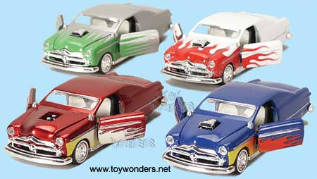 18029D 1949 Ford Coupe Custom Rod Big Engine. 1:36 scale diecast model. This 1949 Ford Coupe is a 5.25" long diecast with pullback motor action. This 49 Ford Coupe also has openable doors. Tins' Toys. 12 pcs per display box and in assorted colors.