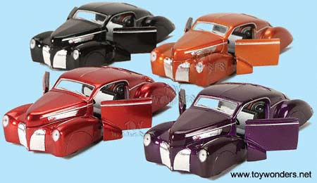 18040D 1937-1939 Lincoln Zephyr Custom Street Rod. 1:43 scale diecast model car. This 1937-1939 Lincoln Zephyr is a 5.5" long diecast with pullback motor action. This 37-39 Lincoln Zephyr has opening doors/hood/trunk. Tins' Toys. 12 pcs per display box and in assorted colors. 48 pcs per inner box.
