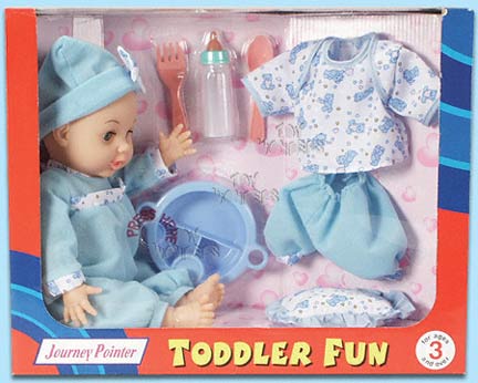 2313M Try Me Toddler Fun Set. 12" battery operated doll with changeable shirt and pants, fork, spoon, pillow, dish, milk bottle and makes different baby sound effects. Includes batteries. Box size: 15"L x 5"W x 12"H. 6 pcs/inner.