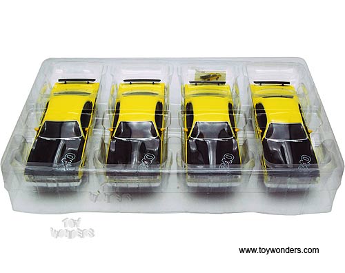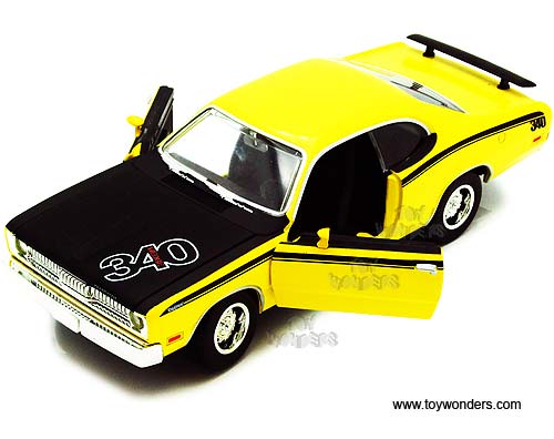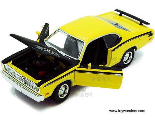 39456C Tomy ERTL - 1971 Plymouth Duster 340 Hard Top. 1:24 scale diecast collectible model car. This Plymouth Duster 340 is an 8"Lx 3"Wx 2.25"H die cast metal car with openable hood & doors, turnable front wheels and free wheeling. This 71 Plymouth Duster 340 is manufactured by Tomy. 4 pcs per tray packed in clear plastic. 39456 in YELLOW color with Black hood.