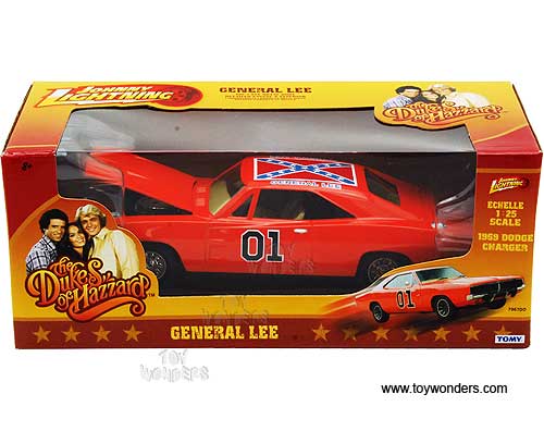 7967DO Tomy Johnny Lighting - General Lee 1969 Dodge Charger Hard Top #01 from the Dukes of Hazzard. 1:25 scale diecast movie model car. This Dodge Charger is an 8"L x 3"W x 2"H with openable hood. Doors do NOT open. Individually packed in a window box WB. Box size measures 10"L x 4.5"W x 4"H. This 69 Dodge Charger is manufactured by Tomy. 7967D is in ORANGE color with flag.