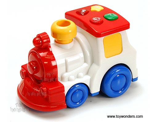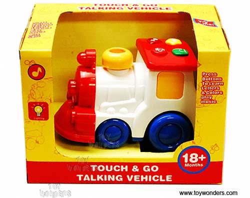 7030 Touch & Go Talking Vehicle w/ Lights & Sounds. This Talking Locomotive Train features different buttons with different functions (flashing lights, moving, and teaching different shapes & sounds). Includes 2 "AA" batteries. Box size: 7.5"L x 5"W x 5.5"H. For 18 months and up. 18 pcs per inner.