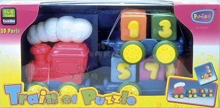 3104 Train of Puzzle. 27" long, three-section train that has letters, numbers and blocks that snap on & off the train. 20 parts in total. For ages 1.5 years to 5 years. Box size: 20"Wx9.5"Hx6.5"D.