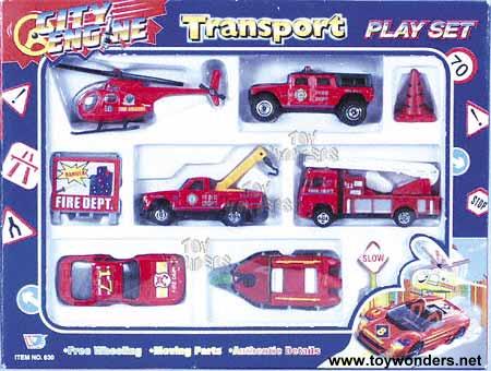 630/4 Transporter Set. These 2.75" to 8" long diecast vehicles in assorted sets: Fire Department., Police Department., construction, and military. Vehicle types includes car, jeep, helicopter, trailer, & more. 36 pcs per inner box.
