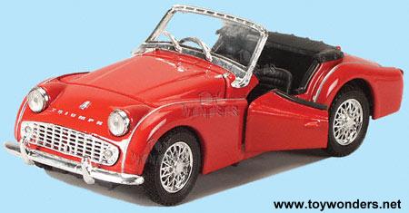 DP6001/2 Triumph TR3A (1960). 1:24 scale diecast model. 6.5"Lx2"Hx2"W diecast car with opening doors/trunk/hood. This 60 Triumph TR3A is assorted in black, red, green & ivory colors in Hard Top and Convertible. This 1960 Triumph TR3A is manufactured by Saico. 8 pcs per display box. 24 pcs per inner box.