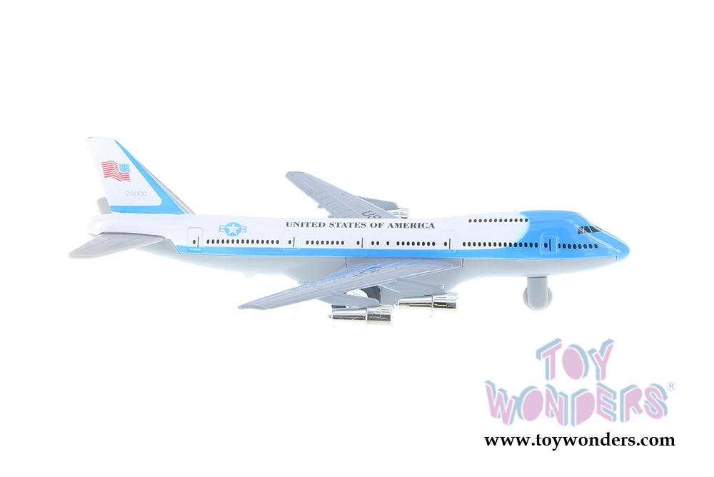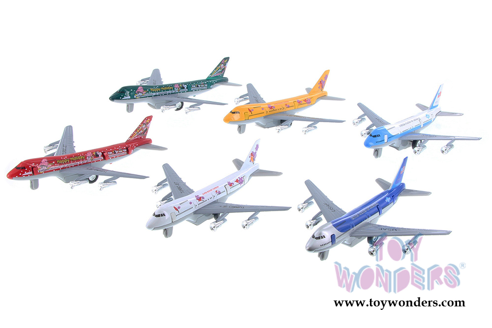 981DF Turbo Jet Happy Holidays. These 7.25" long x 6" wingspan, diecast metal jumbo planes feature pullback motor action and opening fuselage doors. 6 pcs per display box and in assorted colors. Standard and "Happy Holidays" decals assortment. 48 pcs per inner box. Z8
