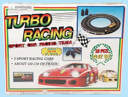 06243 Turbo Racing. Race set includes 2 sport racing cars, 150 cm of track. Requires 4 "AA" batteries.