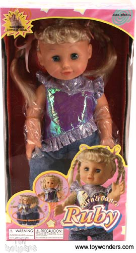 PT1691 Turn & Dance Ruby. 16" battery operated dancing doll with swinging head, up and down moving hands and turning around. Her eyes will close when lying down. Requires 3 "AA" batteries (not included). Box size: 16.25" x 8.5" x 4.75".