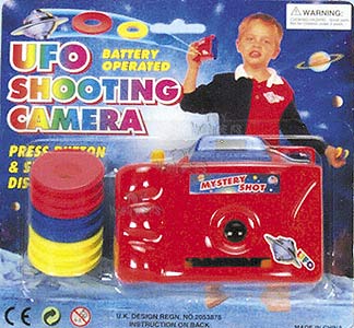 6789S Shooting Camera. 4.25" wide battery operated disc shooter that shoots out safe, soft and colorful discs. Includes 10 soft foam discs. Requires two "AA" batteries. Blister card size: 8" x 8.25". 24 pcs/inner.