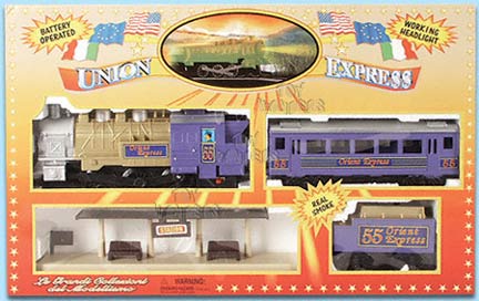 555S/3 Battery Operated Union Express. Set includes a 9" long locomotive, a 8" passenger coach. a 4.5" coal car, and a 11" train station. Box size: 18.25"L x 11.25"W x 2.75"H. Note: This item contains no any diecast metal.