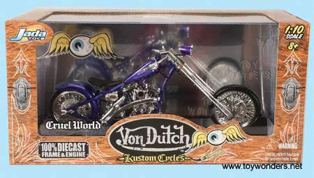 90090PU Von Dutch Chopper-Cruel Wrold. 1:10 scale. This Von Dutch motorcycle is 11.5" long  with 100% diecast frame and engine. This Von Dutch Chopper is extremely detailed and sits in a clear display case with mirror. Cruel World. This Von Dutch bike is manufactured by Jada Toys.