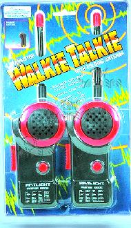 208 Walkie Talkie. A set of walkie talkie with four transistors and safety flexible antenna. Each handset requires one "9V" battery. Card size: 8.5?x13?. 12 sets/inner.