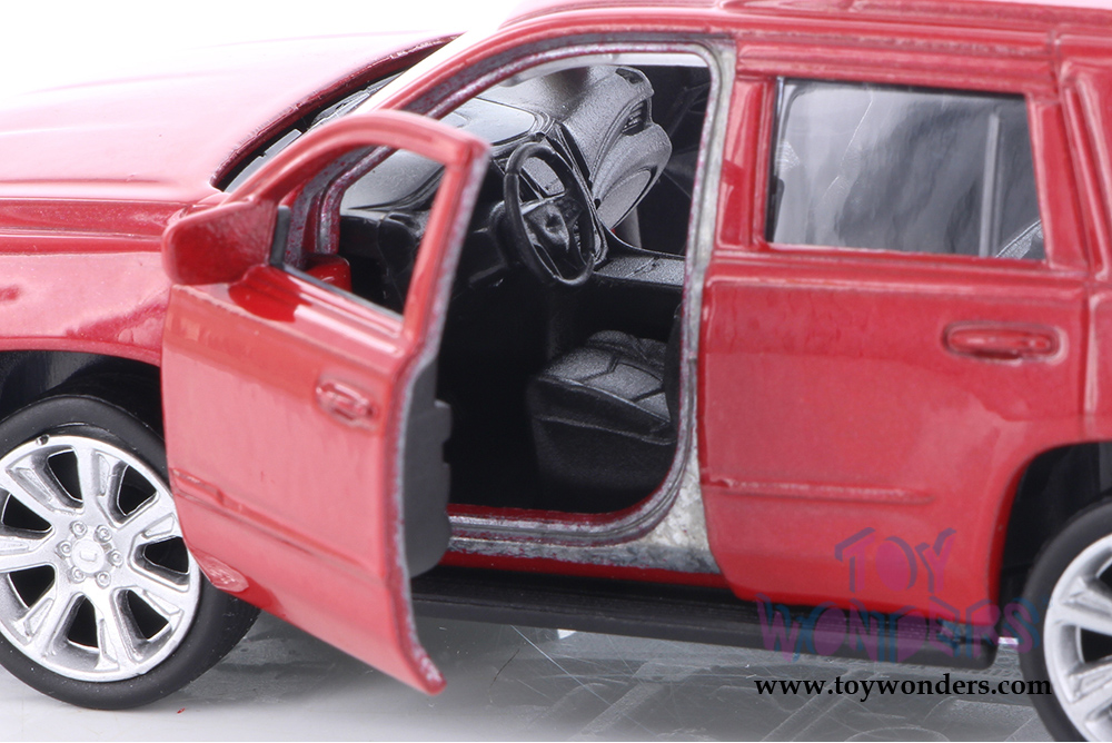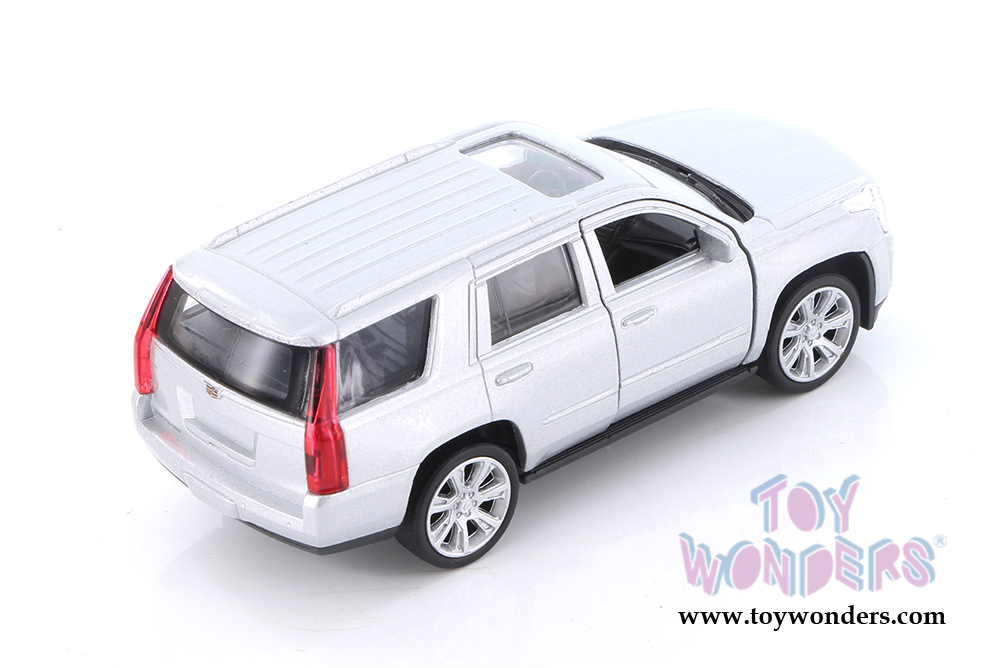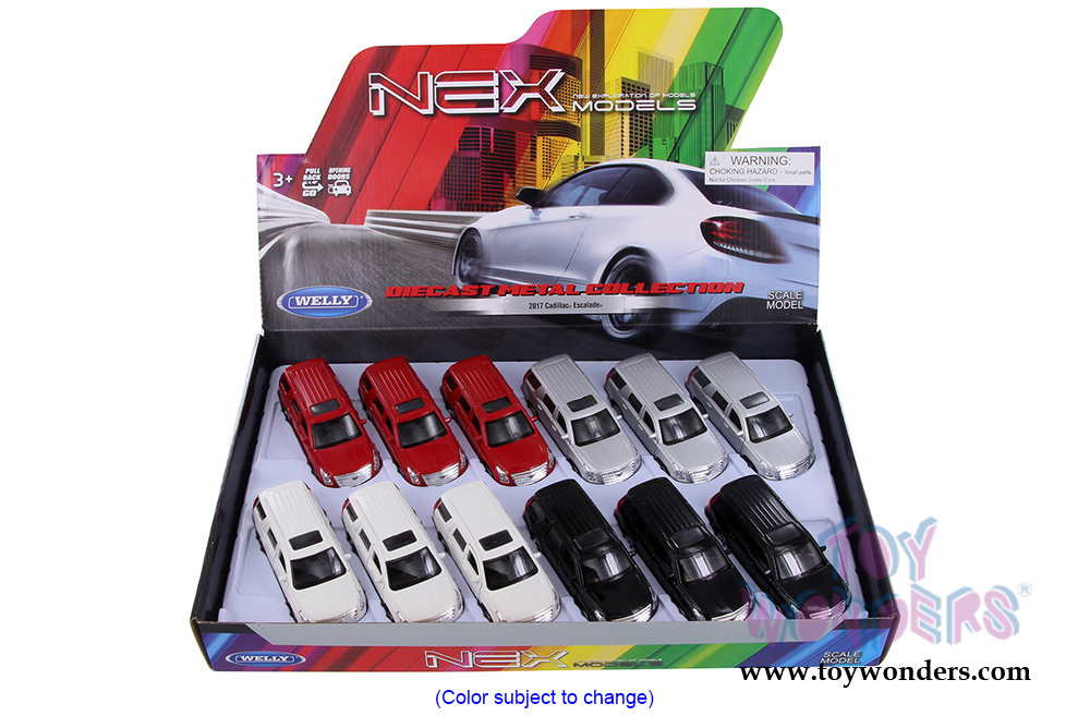 43751D Welly - 2017 Cadillac Escalade® SUV. 1/34-1/39 scale diecast collectible model car. This Cadillac is a 4.5" long diecast metal car with openable doors and pullback motor action. This SUV is manufactured by Welly. 12 pcs per display box and in assorted colors. 72 pcs per inner box.