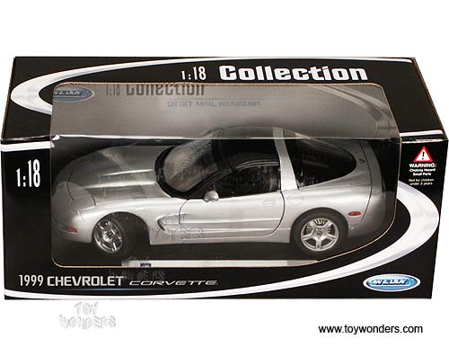 19839SV Welly - 1999 Chevrolet Corvette Hard Top. 1:18 scale diecast collectible model car. This 1999 Chevy Corvette is a 10.25"Lx 3.5"Wx 2.5"H diecast collection car with openable doors & hood. It features steerable front wheels, detail components, and is mounted on a display stand. This 99 Chevy Corvette Hard Top is manufactured by WELLY. 19839 in SILVER color. Individually packed in a window box.GM is a trademark of the General Motors Corporation.