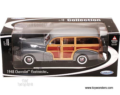 19848GY Welly - 1948 Chevrolet Fleetmaster. 1:18 scale diecast model car. This Chevy Fleetmaster is an 11.75"L x 3.75"W x 4"H die-cast woody with openable doors & hood. Workable steering. Detail exterior & interior. Display platform. This 48 Chevy Fleetmaster is manufactured by WELLY. Item 19848 is in GREY color. Individually packed in a window box. Box size: 14.35"L x 6.5"W x 6"H. GM is a trademark of the General Motors Corporation.