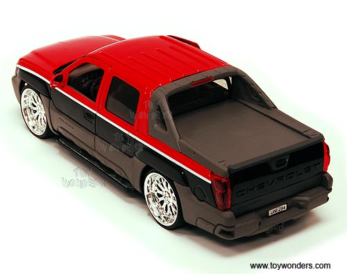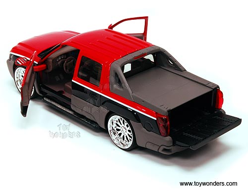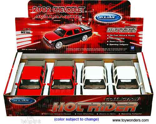 22094LR/4D Welly - 2002 Chevy Avalanche Pickup Truck. 1:24 scale diecast collectible model. This Chevrolet Avalanche pick-up truck is an 8"L x 3"W x 2.5"H die cast with openable doors & tailgate. This 02 Chevy Avalanche Pick up is manufactured by WELLY. 4 pcs per display box and in assorted colors. 16 pcs per inner box. GM is a trademark of the General Motors Corporation.