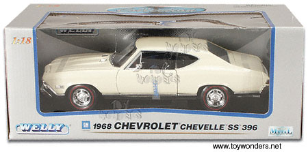 9866BE WELLY - 1968 Chevrolet SS396 Chevelle Hard Top. 1:18 scale diecast model car. This 1968 Chevy Chevelle SS 396 is 10.5"Lx 4"Wx 3"H diecast collection muscl car with opening doors/hood/trunk. The 68 Chevelle features steerable front wheels and s mounted on a display stand. The 1968 Chevelle is manufactured by Welly. 9866 in CREAM color (BEIGE like color). Individually packed in a window box.